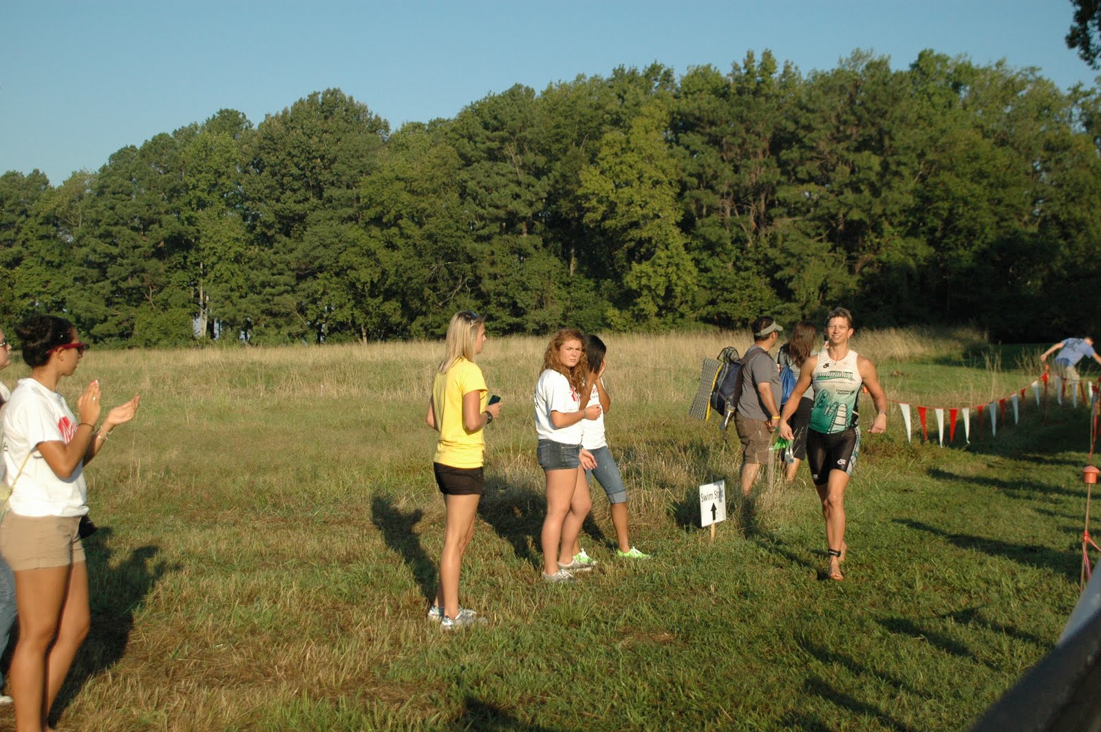 It was a quarter mile run to T1 with sand, grass, bogs, rocks, and carpet along the way.